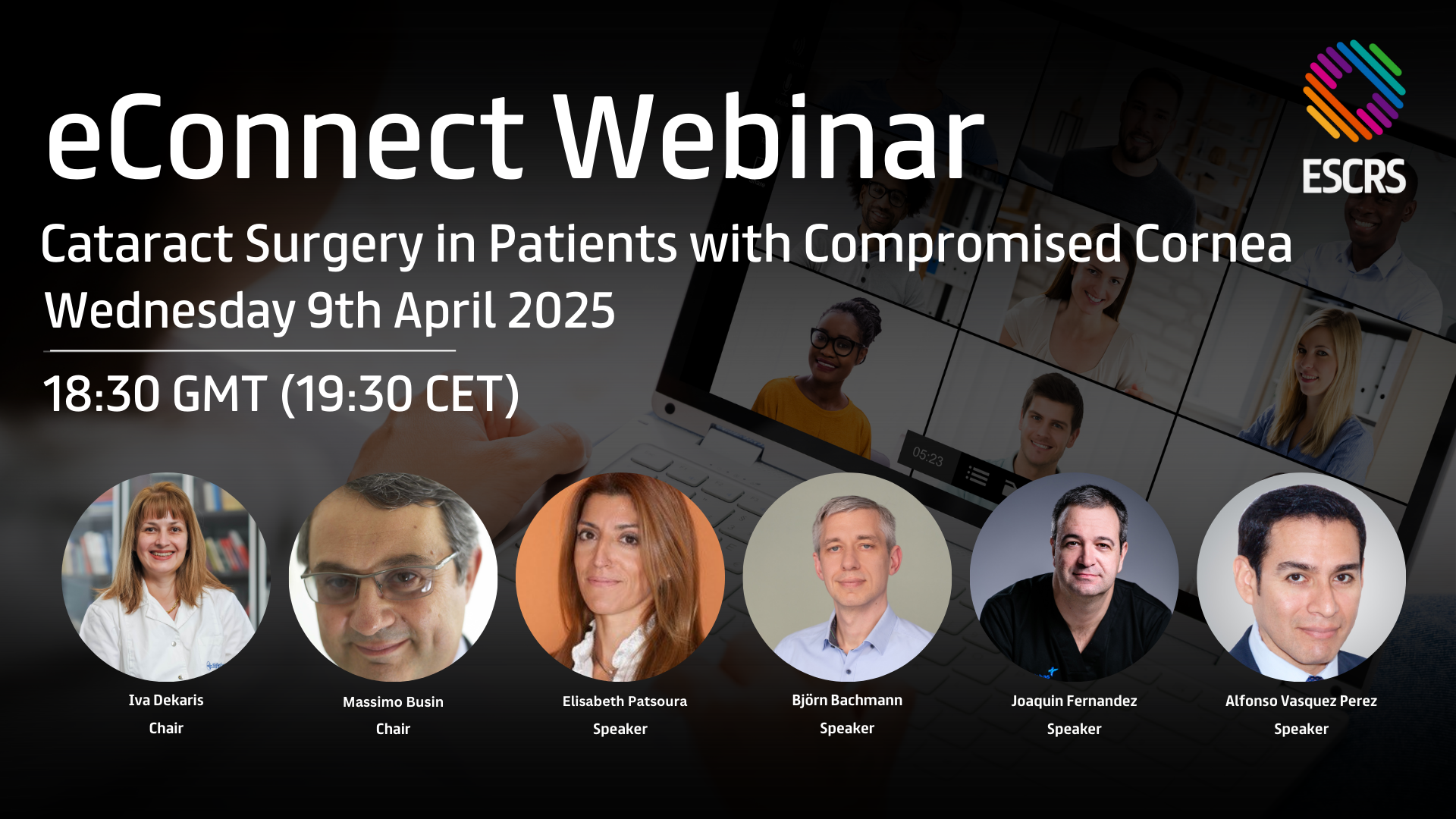 We are excited to invite you to the upcoming ESCRS eConnect Webinar dedicated to the complexities of Cataract Surgery in Patients with Compromised Cornea. This event will delve into the challenges and innovative solutions associated with performing cataract surgery in cases of impaired corneal health.