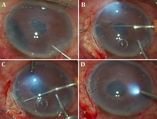 Take care passing the needles into the AC to avoid snagging onto corneal fibres at the paracentesis—which results in the prolene suture catching at the incision and not being able to be pulled freely into the AC. Such a situation necessitates cutting the suture and restarting. A simple modification, described by Dr Amar Agarwal, uses a trocar passed through the paracentesis. Passing the double-armed needles through the trocar removes any chance of the needle accidentally engaging corneal tissue during its passage. The trocar can be removed once the loop lies free within the AC.