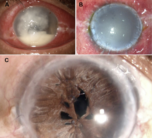 The prognosis is not always bleak, however. A therapeutic graft can often clear infection and save the eye. In fact, the primary aim of a successful TPK is only infection clearance and not visual rehabilitation. Therefore, following successful recovery from a TPK, the patient often has an oedematous and failed graft—usually vascularised because of intense postoperative inflammation, lack of steroids, and sometimes inadvertent retention of loose sutures. Fibrin and exudates in the anterior chamber (AC) are common postoperatively, and these may resolve, leaving extensive peripheral anterior synechiae (PAS) in their wake, which can result in angle closure glaucoma.