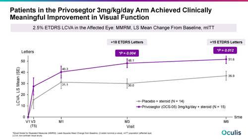 Function was assessed by measuring 2.5% low contrast visual acuity (LCVA). The results showed a clinically meaningful improvement from baseline to month three in the privosegtor group (+48.1 ETDRS letters) that was maintained at month six with a difference in LCVA improvement versus placebo of 18 letters at month three and 15 letters at month six (nominal P values for treatment group differences -0.004 and 0.012, respectively).