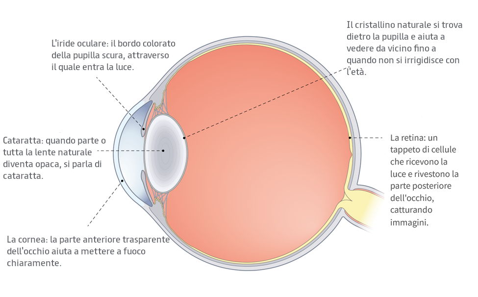 La cataratta è un appannamento del cristallino naturale, che si trova dietro la pupilla e aiuta a focalizzare la luce sulla retina. L'intervento di cataratta prevede la sostituzione del cristallino naturale appannato con un piccolo impianto sintetico trasparente chiamato lente intraoculare (IOL). Il potere di messa a fuoco della IOL può essere scelto in base alle esigenze dell'occhio.