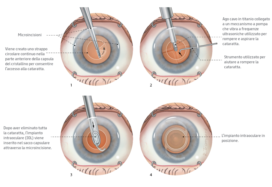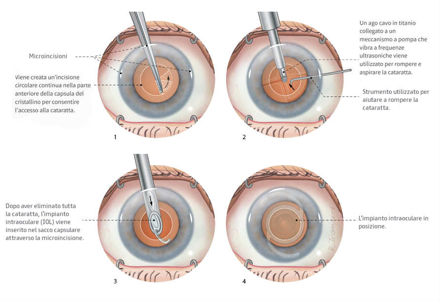 - Facoemulsificazione - liquefazione e rimozione del cristallino naturale dall'interno della capsula del cristallino mediante un piccolo ago vibrante ad alta frequenza, e lavaggio intraoculare comandato da una pompa di aspirazione.