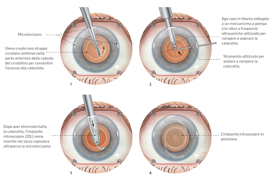 - Facoemulsificazione: liquefazione e rimozione della lente naturale dall'interno della capsula del cristallino utilizzando una sonda vibrante ad alta frequenza, lavaggio con fluido