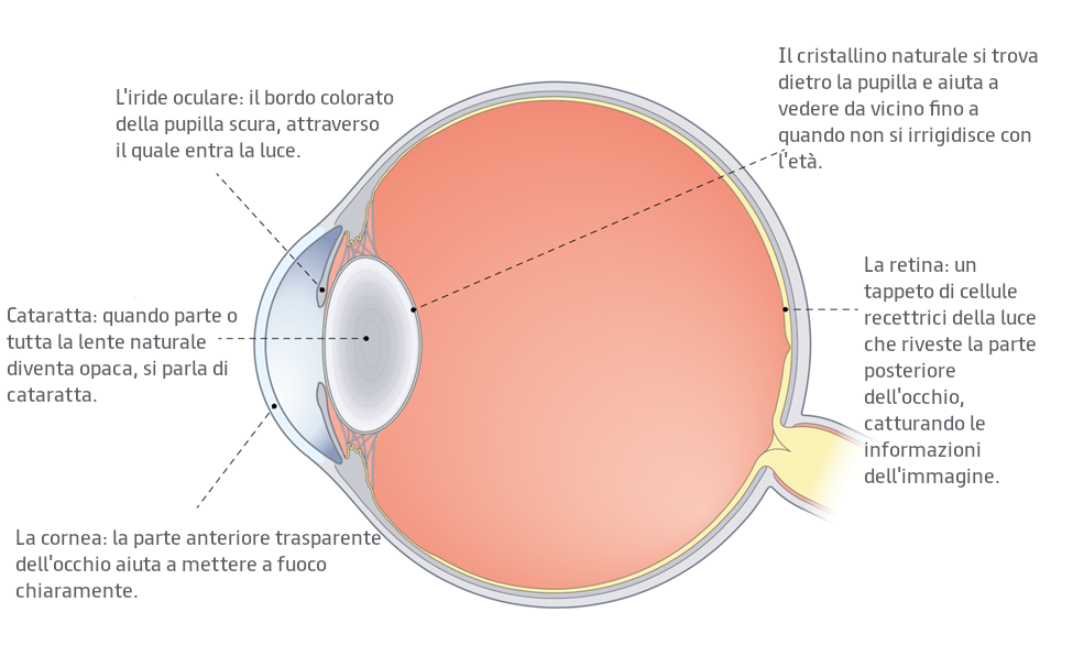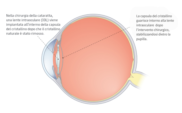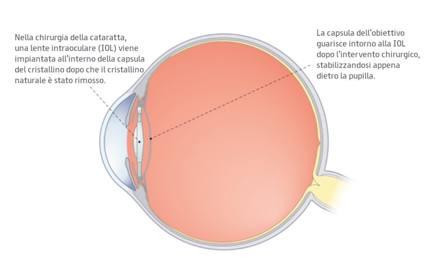La cataratta è un appannamento del cristallino naturale, che si trova dietro la pupilla e aiuta a focalizzare la luce sulla retina. L'intervento di cataratta prevede la sostituzione del cristallino naturale appannato con un piccolo impianto sintetico trasparente chiamato lente intraoculare (IOL). Il potere di messa a fuoco della IOL può essere scelto in base alle esigenze dell'occhio.